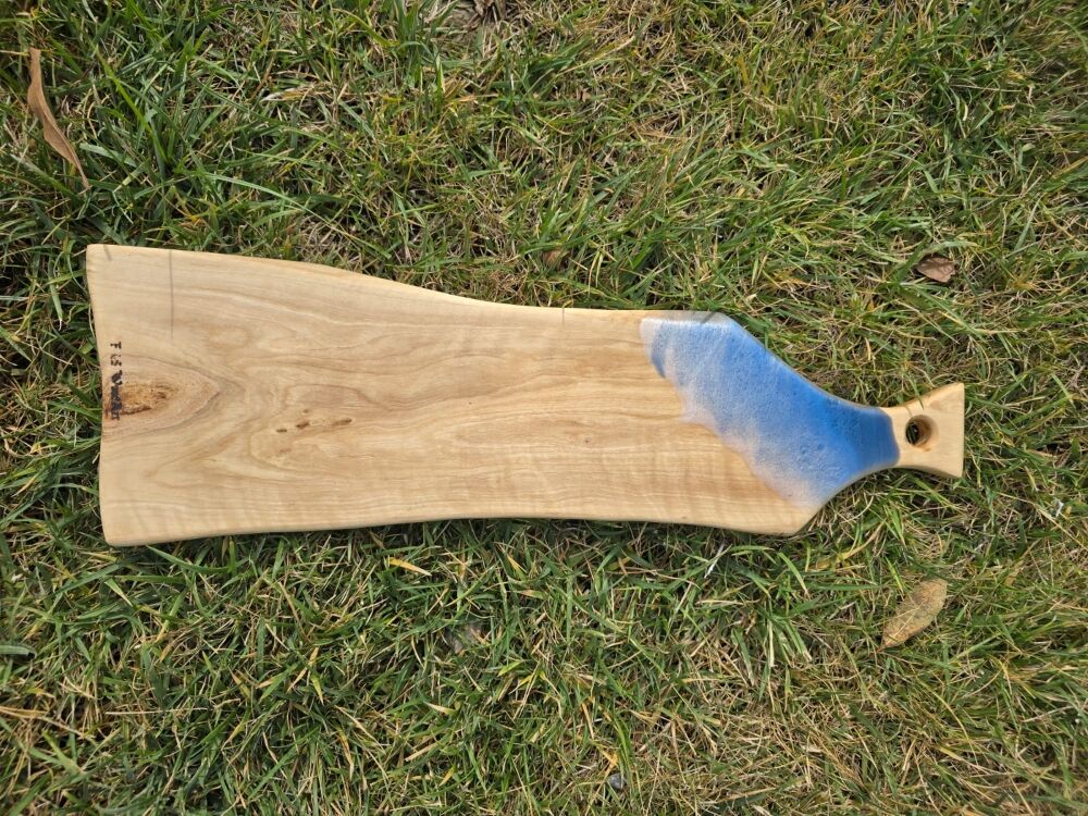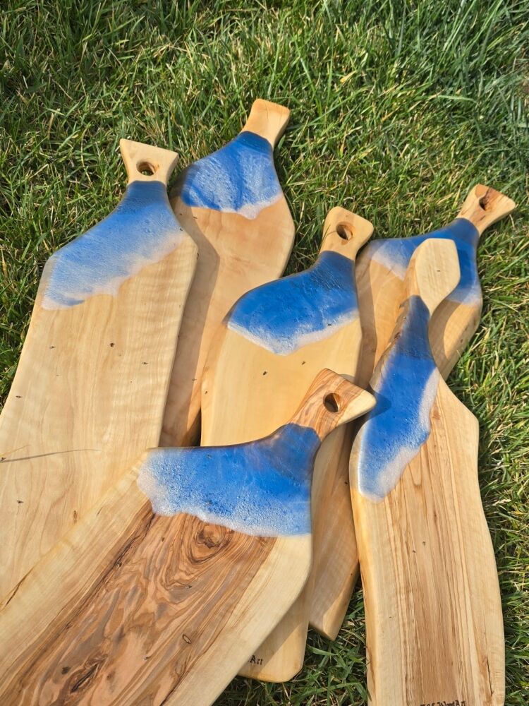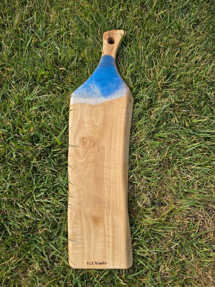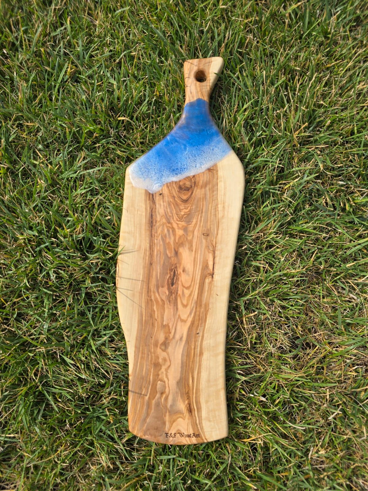 38 X 11 Cm Doğal Zeytin Ağacı Mavi Deniz Dalga Epoksi Saplı Kesme Peynir Sunum Tahtası