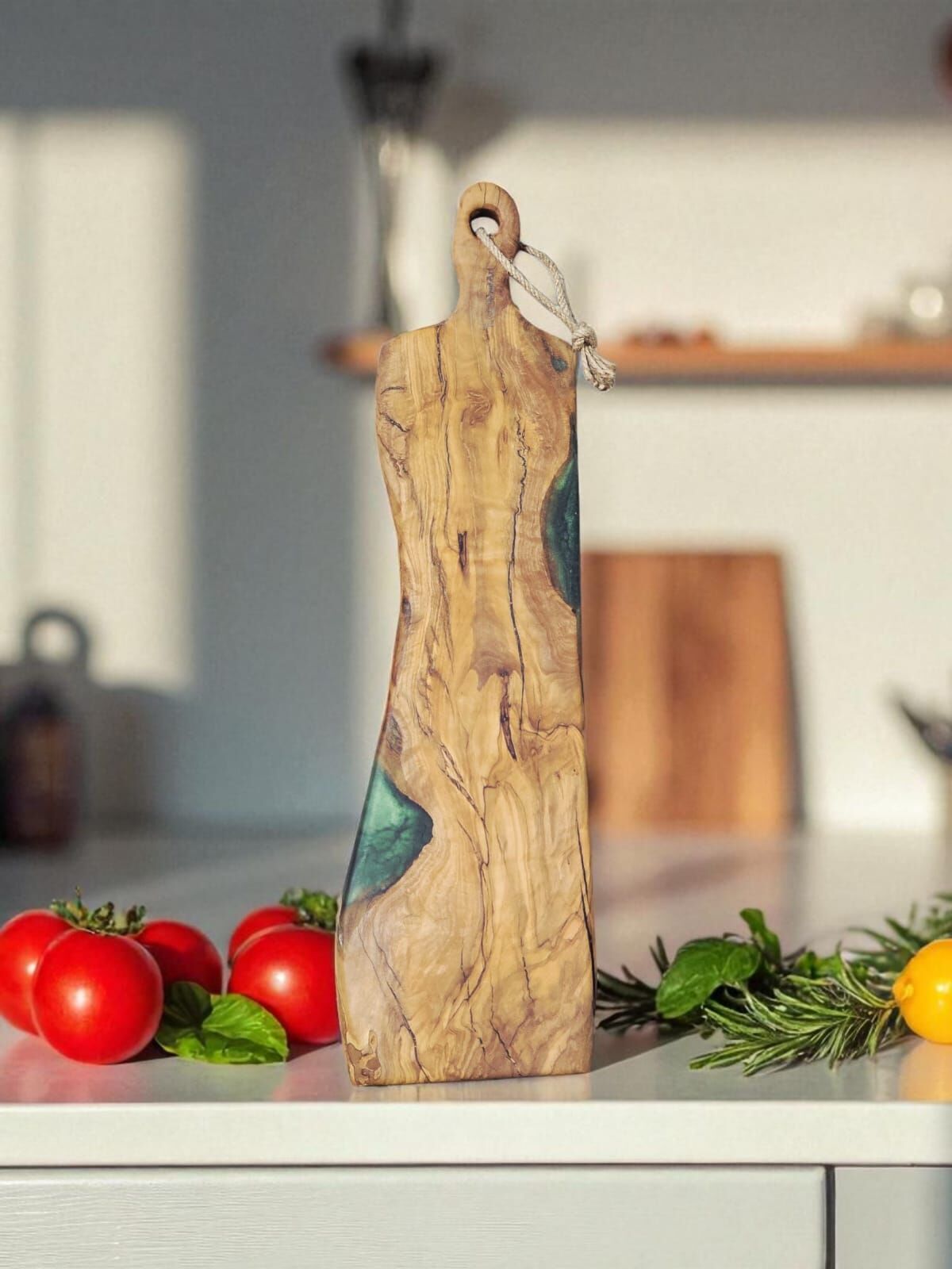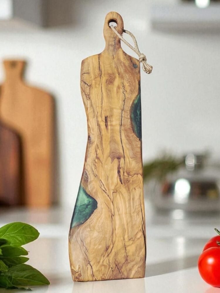 50 x 11 cm Doğal Zeytin Ağacı yeşil epoksi dolgulu saplı kesme sunum tahtası