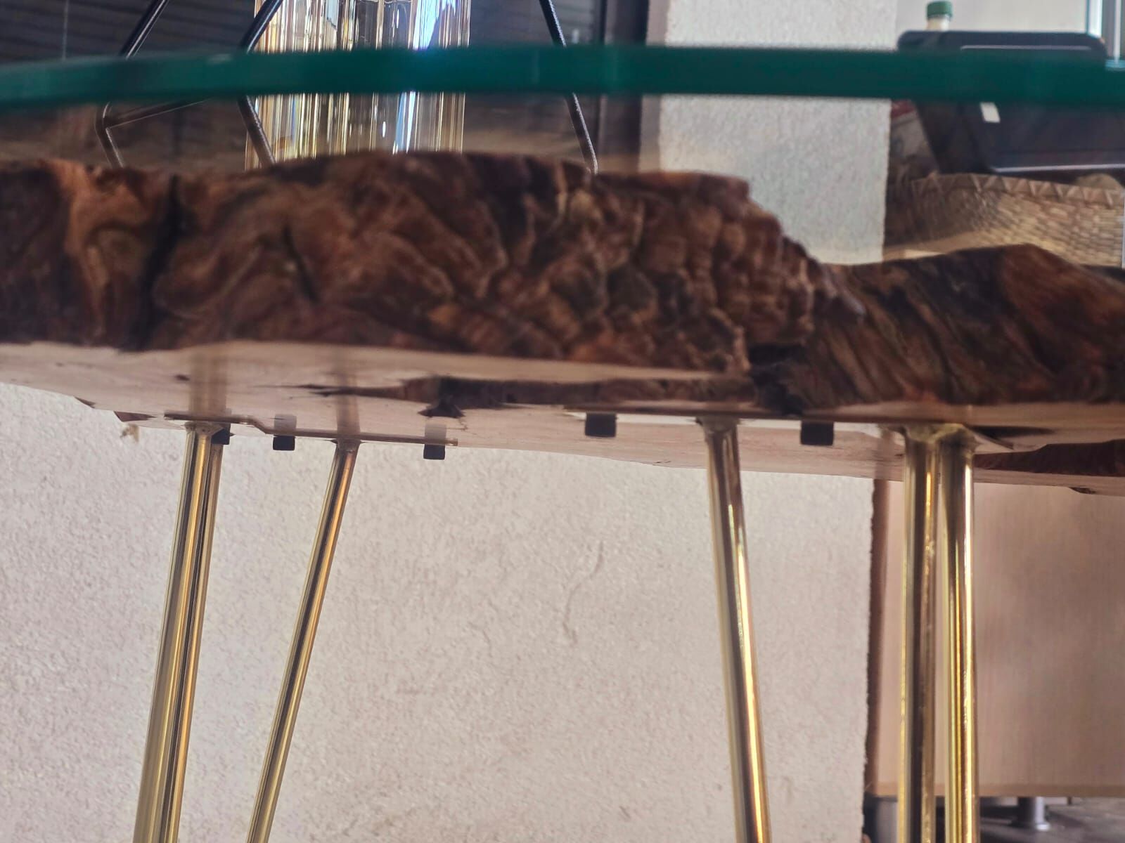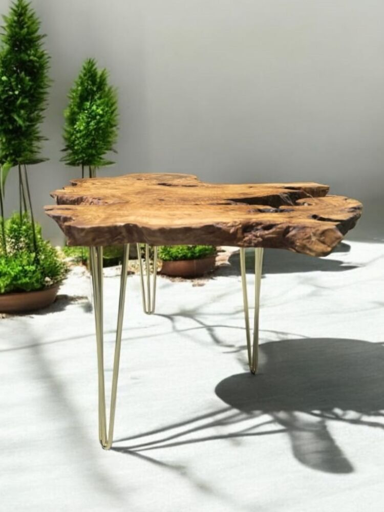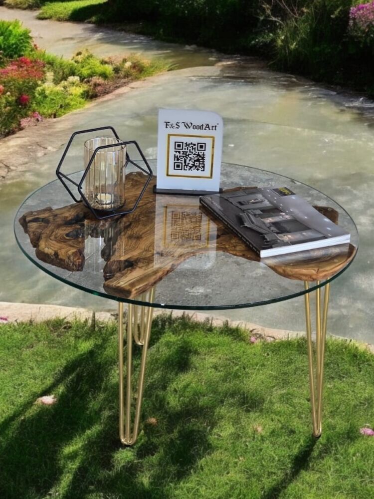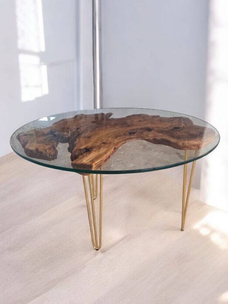 Zeytin Ağacı Doğal Ahşap Kütük Sehpa 82 Cm çap 54 Cm Yüksek - Gold Firkete Ayak - 10 Mm Cam Dahil