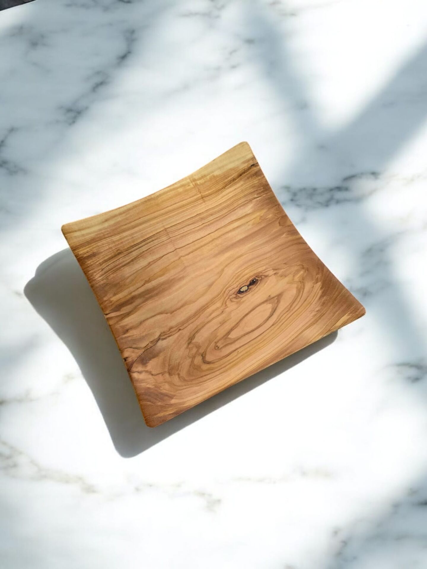 Zeytin Ağacı Tek Parça El Yapımı Doğal Ahşap Dekoratif Köşeli Tabak 20 X 20 Cm